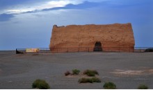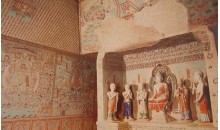 晉(317-420年)壁畫墓位于墓群南端的陶家莊。由于是70年代才開始發(fā)掘,所以并不被外界所熟悉。壁畫墓距地表12米,封土殘高2米,前有長(zhǎng)33米,寬1.42米的斜坡墓道直通墓室,墓室全用平磚疊砌,分前后兩室,前室四壁和頂部布滿彩色畫面,后室只在后壁施畫。由于這里氣候干燥,壁畫保存基本完好,此墓的發(fā)現(xiàn),是河西走廊第一次發(fā)現(xiàn)東晉壁畫墓。