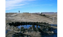 克拉瑪依泥火山位于獨(dú)山子北部的一個(gè)山峰上,主要有兩個(gè)噴出口兩者相距約100余米,較大的一個(gè)噴口直徑約60厘米,高出地面1米余。噴口內(nèi)是粘稠的泥漿,泥漿呈灰綠色,略帶油氣味,不停的向外翻泥泡,匯集的泥漿沿西南側(cè)的開(kāi)口外溢。涌出的泥流在地表形成錐型丘,底部直徑在10米以上,表面是干裂的泥漿塊。泥火山所在的獨(dú)山子亦很有特色,該山的南北長(zhǎng)約7千米,東西寬約6千米,最高峰1283米,孤立的突兀于傾斜平原之上。