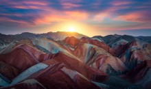 當(dāng)峰回路轉(zhuǎn)之際,車前方忽現(xiàn)一座狀如巨廈的深駝色的山峰,似有廊有柱,有塔有亭,樓閣錯(cuò)落,宛如"布達(dá)拉宮",令人詫嘆不軒。復(fù)前行,又見一色彩斑斕之奇峰,通體呈赭紅色,但另有絳紫、桃約、玫瑰紅、青綠、淡黃、淺灰、月白、深黛……的色塊、條紋。