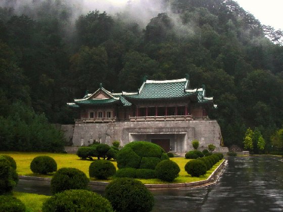 妙香山麓的國際友誼館,由金日成國際友誼館(本館)和金正日國際友誼館(別館)組成,前者比后者大,均為多層大型朝式建筑(與中國的樓閣相似),遠(yuǎn)看似木結(jié)構(gòu),其實(shí)為混凝土建筑。金日成國際友誼館,始建于1974年,1978年8月28日開館,展覽館為6層樓房,建筑高43.3米,總建筑面積為5萬多平方米,190個房間。它的主要部分不是下圖中那外表的建筑物,而是開鑿在其后的大山中的山洞部分。展覽館按大洲和國家陳列著世界一百七十多個國家的政黨、國家元首、社會界和政界人士向金日成贈送的禮品,禮品達(dá)22萬多件。