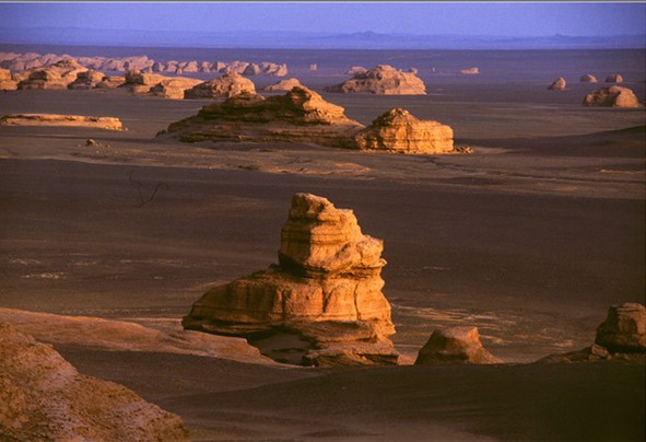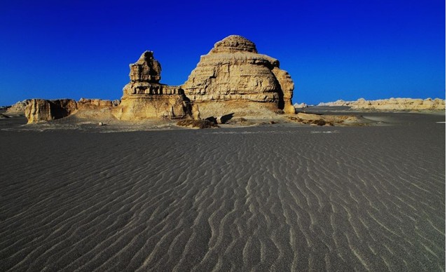 白天,遠遠望去,沙漠幻景猶如煙波浩渺的大海,整個"雅丹魔鬼城"恍若飄浮其中。傍晚蜃景隱去,整個"雅丹魔鬼城"籠罩在夕陽余輝下,金碧輝煌中更顯幾分神秘,幾分肅穆。夜幕降臨后,狂風呼嘯,整個"魔鬼城"又陷入恐怖的氣氛中,令人毛骨悚然。