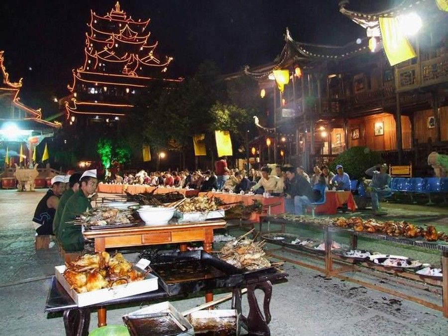 進(jìn)入土司城,首先看到土司城迎賓儀式,土家漢子迎賓鼓,吹牛角、放沖,土家姑娘攔門歌,敬攔門酒,進(jìn)入城內(nèi),在祭祀堂前舉行百人土家大祭祖活動,男女老少唱擺手歌、跳擺手舞,登世界最高的吊腳樓九重天,參觀土家族千百年來文化展示。到土家山寨,聽土家歌,賞土家族最有代表風(fēng)俗哭嫁,三棒鼓,花燈等民俗表演。