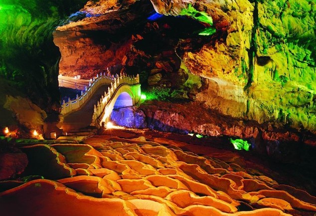 洞內有無數(shù)千姿百態(tài),瑰麗多彩的鐘乳石,游覽范圍共分三層:上中兩層為陸地層,廳堂高大寬闊,巖壁堅固,雄偉壯觀,“瀑布”“山林”“谷”“田園”“瑤寨”百花爭艷,鳥飛云走……;下層是一條地下暗河,由北向南蜿蜒1500米,經過三個美麗的峽谷,穿過四座山頭底部,河面寬1.6米,水深1-7米,兩岸奇景密布,巧奪天工,美不勝收。有洞中之寶”金雞報喜”飛象過河”還有地下河最高最大,版權所有山東聊城聊之旅國際旅行社有限公司,轉載必究!一物兩景的“壽星公”“飛瀑奇石”“花鳥神閣”……。各處自然美景無不讓人吧為觀止。樂而忘返!