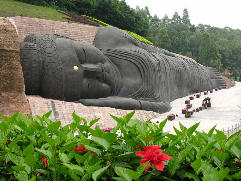 大臥佛位于森林公園天仙巖。相傳當年佛教大師六祖惠能傳教后深夜經(jīng)過這里,看到天仙巖靈光閃爍,隱約可見這塊橫臥的大石塊就是一個大臥佛,六祖立即跪拜,求佛祖降福天下。大臥佛的雕造從這個傳說獲取靈感,以盛唐敦煌臥佛為范本,佛身長108米,尺度堪稱世界之最?,F(xiàn)經(jīng)改造用紫銅包裝大臥佛,版權(quán)所有山東聊城聊之旅國際旅行社有限公司,轉(zhuǎn)載必究!成為金裝大臥佛。大佛前面是錦鯉池和荷花池,與大佛相互映襯引人入勝。大佛對岸一層為長六十米的長廊,廊內(nèi)彩繪佛傳故事,二層為敬佛臺,憑欄對拜,大佛全景一覽無遺。