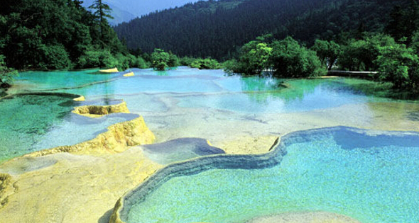 進(jìn)入黃龍景區(qū),首先看到的是一組精巧別致、水質(zhì)明麗的池群--迎賓池。池子大小不一,形狀奇特,色彩艷麗,錯(cuò)落有致,四周山岳環(huán)峙,林木蔥蘢,山間野花競(jìng)放,彩蝶飛舞。山間石徑曲折盤旋,點(diǎn)綴著觀景亭閣,倍添情趣。