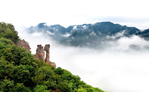 它四壁如削,奇崖怪石,千姿百態(tài);或如危塔,或如城闕,或如樓閣,或成壇臺,連綿不斷,鬼斧神工,有相對高度差別不大的16座山峰,依次為梳妝臺、南天門、造鐘峰、望鄉(xiāng)峰、月老峰、抱犢峰、鳳凰嶺、燕子峰、金壇峰、睡仙峰、息壤峰、千佛山、萬佛山、大獨(dú)立峰、小獨(dú)立峰、將軍寨,多呈麗姿、峭壁萬仞,峰上峭石林立,攀路艱難,林繁藤茂,山頂卻開闊平坦,林木茂密,花卉叢生,系一天然草原,頗具歐洲風(fēng)格。