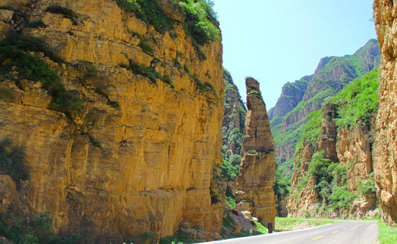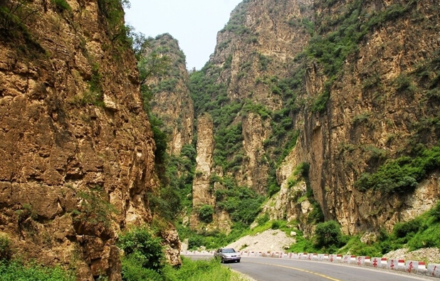 《遼史·地理志》載:“相傳有狐于嶺,食五粒松子,遂成飛狐,故此處地名飛狐口”。這當然只是一個傳說。順盤山公路蜿蜒而行,山石聳立,斧劈刀斷一般,四十里飛狐峪幾乎步步都有看點,隨處可見喀斯特地貌造就的怪石異峰?!耙混南恪惫铝⒍?,傳說中楊六郎為爭國土箭射山峰留下的“箭眼”依稀可見。明崇禎時大學士、兵部尚書楊嗣昌在《飛狐口記》中稱“千夫拔劍,露立星攢”、“有如天門”、“回合萬變”。清人吳蘗昌在《北口峪》中稱其山峰造化神奇,“疑神疑鬼,為人力當不受”。飛狐峪最寬處只有七八十米,最窄處僅一米左右,頭頂只見一線天,堪稱“一夫當關(guān),萬夫莫開”。