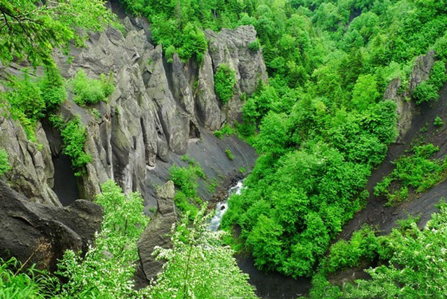 兩岸多數(shù)地帶是坡陡如削的懸崖絕壁,峽谷之中聳立著奇特的熔巖石峰林。