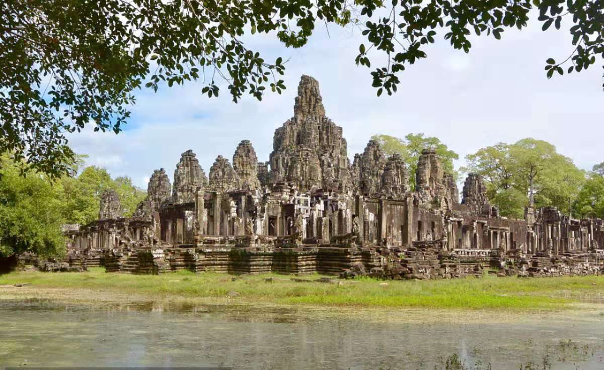 的闍耶跋摩七世驅逐占城人,1181年登基為王,在位三十余年間帝國達至頂盛。他在成為廢墟的首都大興土木,重建吳哥城(Angkor Thom)。鑒于先前被占城入侵的慘痛經驗,闍耶跋摩七世將吳哥城城墻筑得特別高又厚實1,城外建有護城河。城中心的巴戎寺(Bayon), 最著名的就是以闍耶跋摩七世面容為藍本來雕刻的54尊四面佛像,也是“微笑高棉”的由來,寺廟墻上浮雕不只展現闍耶跋摩七世與占城戰(zhàn)斗的壯闊場面,也有描 繪市井小民的生活場景。而因為闍耶跋摩七世篤信佛教,吳哥地區(qū)信仰開始由印度教轉變?yōu)榉鸾?,在巴戎寺中也可以看到印度教與佛教并存的特殊風格。除此之外, 闍耶跋摩七世還建造了大批寺廟如塔普倫寺(Ta Prohm)、達松將軍廟(Ta Som)等,也興建了不少醫(yī)院、旅舍。