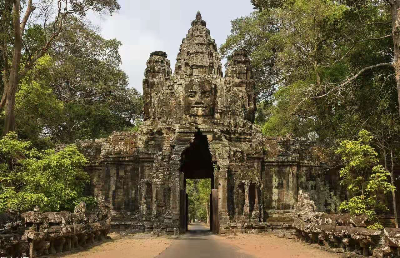 吳哥城呈正方形,由城墻和護城河保護,城墻高8米,整個城市有5道城門,除了東西南北四個正方向處各開有城門外,在東門的北面還開了一座勝利之門,城門都是塔形結構,每個塔身上都有面向四方的四面佛像,以慈悲的眼神檢閱進入城內的每一個人;城墻外就是護城河,城門外各有架有一座橋,連接城里城外,每座橋采用印度教的神話故事,兩邊各有27尊2.5米高的跪坐石雕半身像排成一列,一邊象征神靈,一邊象征惡魔,雙方進行激烈的角力。