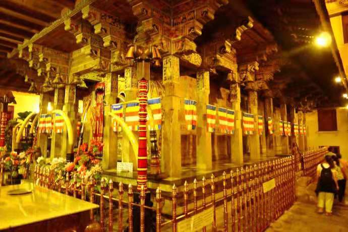 每層小金塔內(nèi)藏著各國佛教徒供奉的珍寶,最后一個小金塔不到1米高,塔頂飾有一枚鉆石,塔里有一朵金蓮花,花芯有一玉環(huán),長約5厘米的佛牙就安放在這玉環(huán)的中間。每日早、中、晚3次在震懾人心的鼓樂聲中,由3位高僧,分持3把不同的門匙開啟內(nèi)殿大門,進入內(nèi)殿,版權(quán)所有山東聊城聊之旅國際旅行社有限公司,轉(zhuǎn)載必究!舉行隆重的敬拜儀式,儀式之后再開啟內(nèi)殿拱門,讓信徒與游人從門外魚貫瞻仰供奉佛牙的佛牙塔。佛牙寺四周有高墻圍繞,圍墻四角各建有一廟,即納特(觀音)廟、摩訶廟、卡多羅伽摩廟和帕蒂尼女神廟,據(jù)說這4座廟是為了保護佛牙建立的。