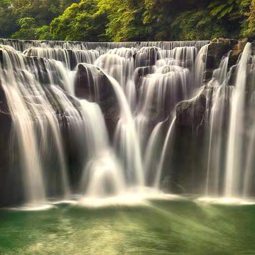 因瀑布如千軍萬馬奔騰、傾瀉而下、水聲四起,墜入一大片寬廣深潭,彌漫的水氣經(jīng)陽光折射,在潭面上映照出美麗的彩虹,與鄰近的“大華壺穴”都有大自然鬼斧神工之美,成為臺鐵平溪支線著名景點,相當受游客歡迎。