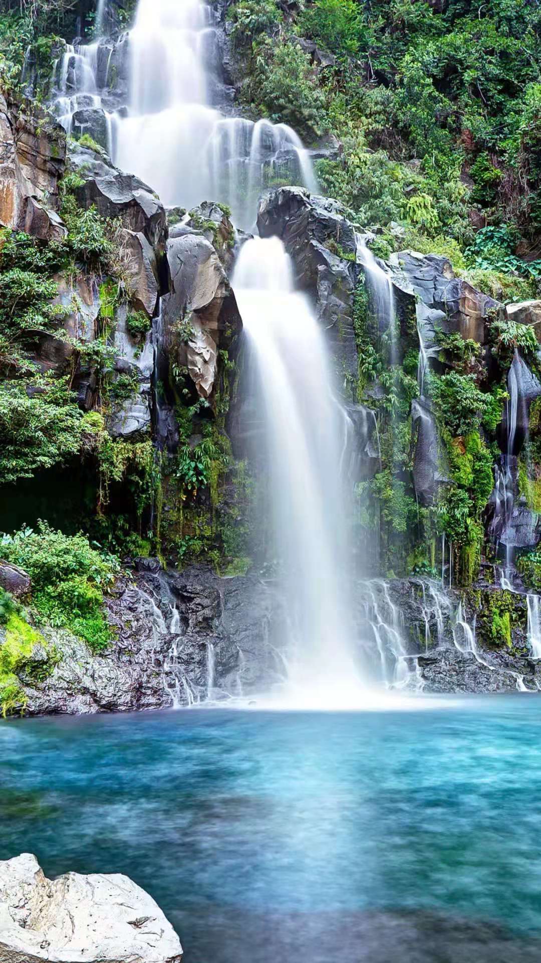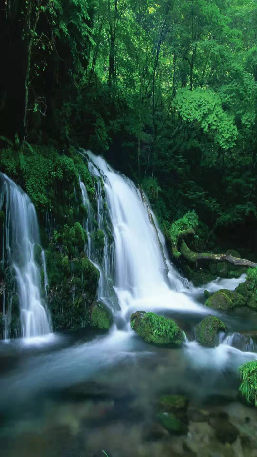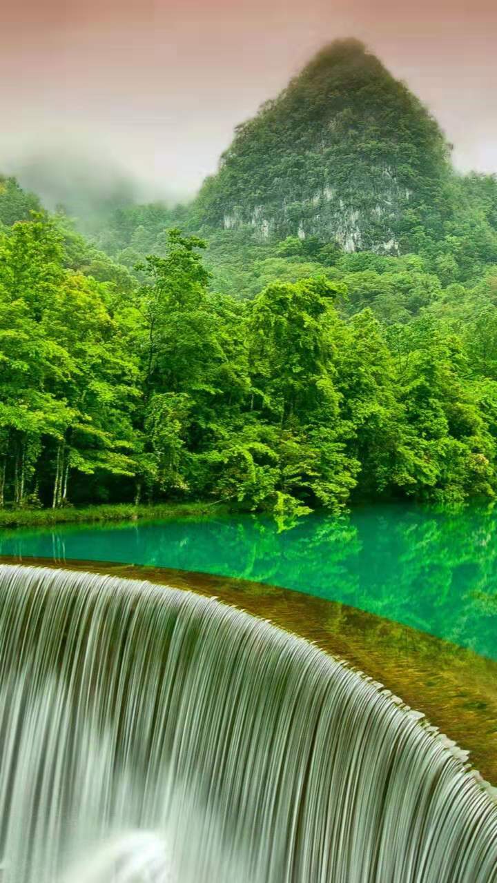 瀑布下方水潭極深,水汽長年彌漫不散,一經(jīng)陽光折射,一道清麗的彩虹跨其上,故又有“彩虹淵”的美名。下游巨石紛立,是崖