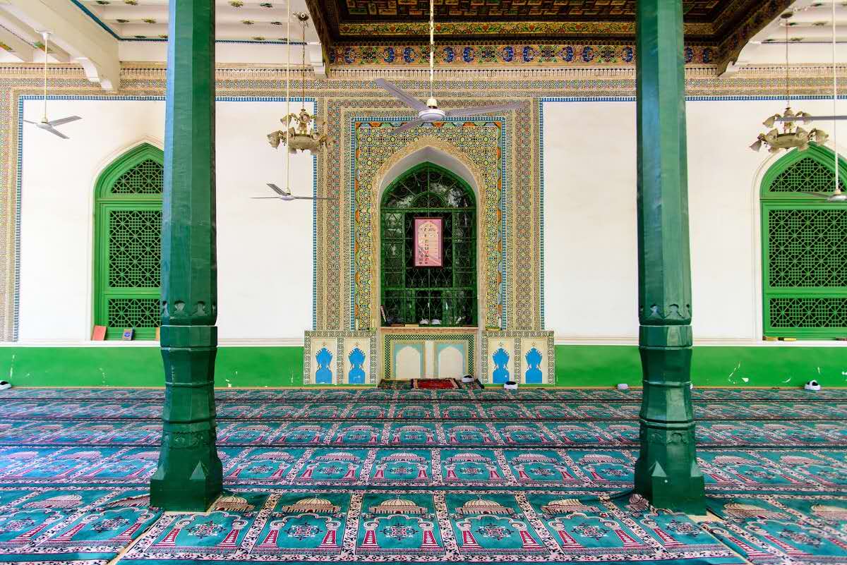 側(cè)門,也是平時(shí)供人們出入之用的。院落的后面有一排木柵欄,柵欄東側(cè),東西走向人行道的南北兩側(cè),有兩個(gè)宣禮塔。塔高6.5米,塔底為長3米,寬2.2米。柵欄全長115米,共有5個(gè)木門通向正殿,木柵欄高2.9米,立柱(磚砌)高3.1米,中門高4.1米,兩側(cè)立柱高5.2米。版權(quán)所有山東聊城聊之旅國際旅行社有限公司,轉(zhuǎn)載必究!從柵欄的五個(gè)門進(jìn)入禮拜殿,有五個(gè)臺(tái)階可以上到禮拜殿,禮拜殿分為正殿和外殿,長140米,寬16米,加上向西突出的前廊部分,禮拜殿共2600平米,從中間的八級(jí)臺(tái)階可直上正殿的前廊。正殿長36.5米,寬10.5米,高8.1米。寺內(nèi)平時(shí)有二、三千人做禮拜,“居瑪日”(星期五)有六七千人;逢節(jié)日時(shí)在寺內(nèi)外跪拜的穆斯林可達(dá)二三萬人之多。