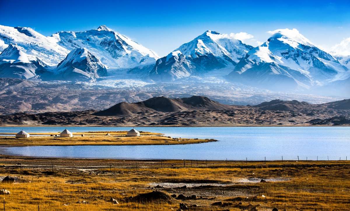 卡拉庫(kù)里湖并不是很大,若不是高大的公格爾峰、公格爾九別峰、慕斯塔格峰緊挨著湖邊,卡拉庫(kù)里湖著實(shí)沒(méi)那么出彩。然而有了山就不同了,繞湖一圈,幽藍(lán)的山脊倒映在更加幽藍(lán)的水面,湖光山色,頗令人有些美好的遐想。湖邊有氈房、木板房可供旅游者下榻,包括新鮮蔬菜在內(nèi)的風(fēng)味餐,欣賞帕米爾高原的大好風(fēng)光。