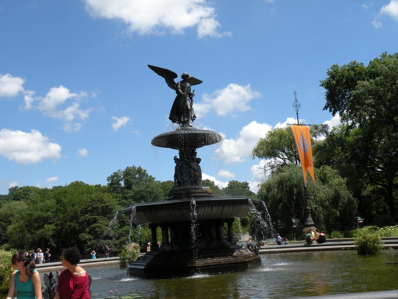 畢士達(dá)噴泉 (Bethesda Fountain) 及廣場(chǎng)位于湖泊與林蔭之間,是中央公園的核心,噴泉建于 1873 年,為了紀(jì)念內(nèi)戰(zhàn)期間死于海中的戰(zhàn)士,而畢士達(dá)之名則是取自圣經(jīng)的故事,內(nèi)容敘述在耶路撒冷的一個(gè)水池因天使賦予的力量,而具有治病的功效,“水中天使” (The Anger of Water) 的雕像,則是取自 Tony Kushner 的史詩戲劇作品“天使在美國(guó)” (Anger in America) ,而圍在噴泉旁的四座雕像分別代表“節(jié)制”、“純凈”、“健康”與“和平”。這座水池常常有成群天鵝悠游其間,也有不少游客在湖中劃船。