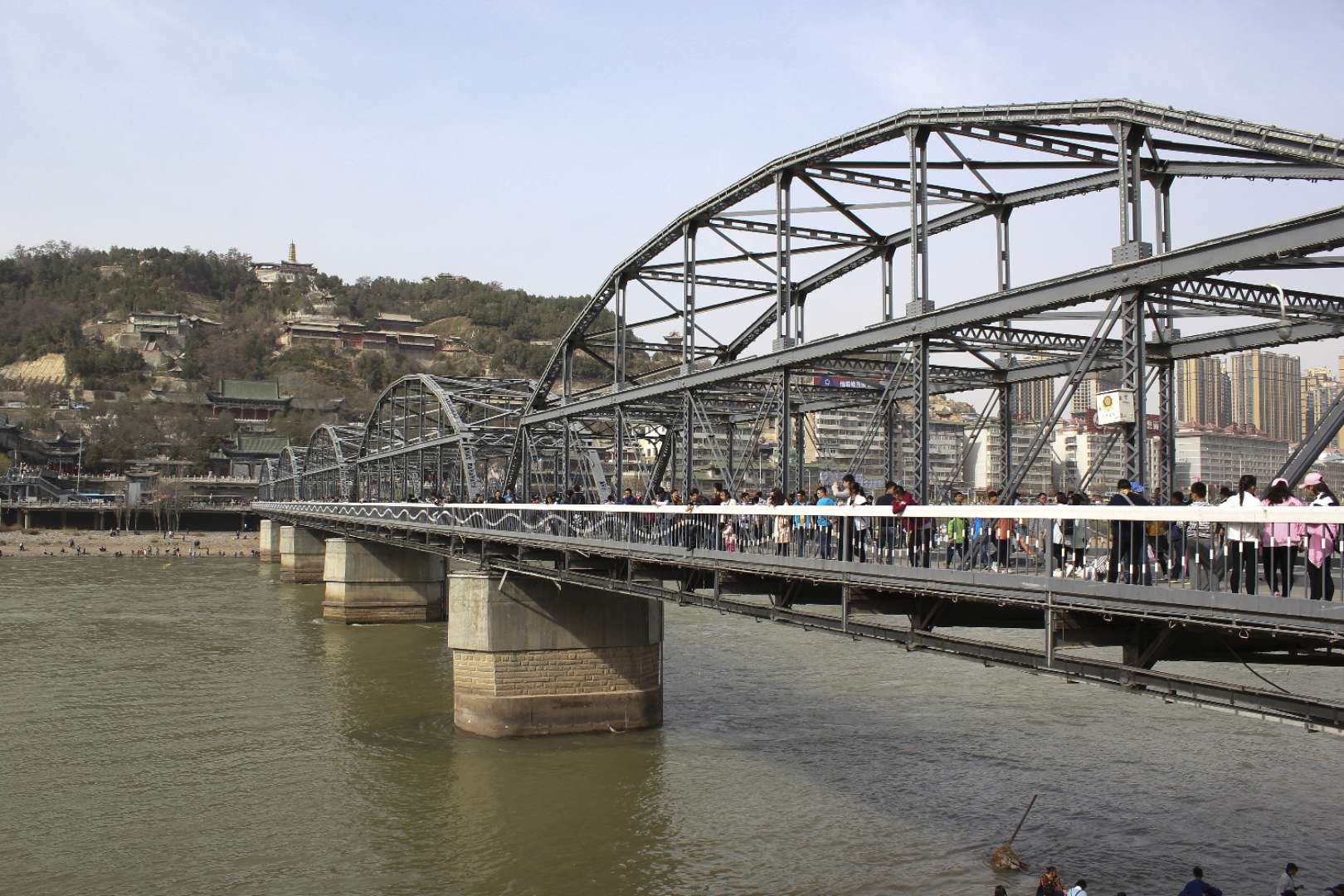 黃河鐵橋位于蘭州城北的白塔山下、金城關(guān)前,有"天下黃河第一橋"之稱,是蘭州市內(nèi)標(biāo)志性建筑之一。鐵橋建成之前,這里設(shè)有浮橋橫渡黃河。浮橋始建于明洪武年間(公元一三六八至一三九八年),名叫鎮(zhèn)遠(yuǎn)橋,今尚存建橋所用鐵柱一根高達(dá)三米,重約數(shù)噸,上有"洪武九年"字樣。