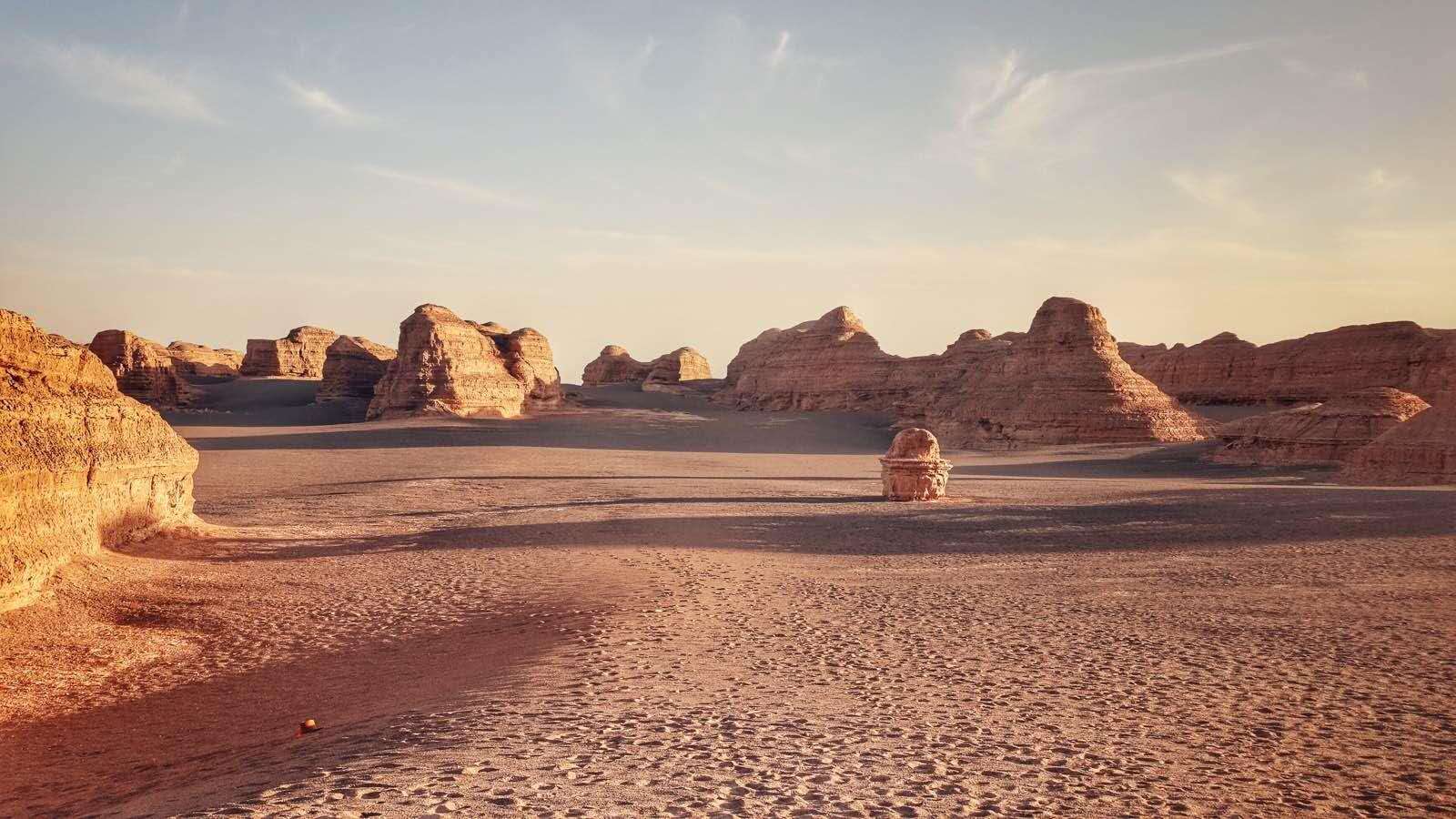 海面上,真是海走山飛、氣勢如虹。當(dāng)置身這座規(guī)模宏大的“古城”之中,確有一種震撼人心的力量,天是那么的高,地是那么的闊,人又是那么的渺小,那種神奇的感受真是難以言表。這座“古城”在不同的時間,不同的天氣條件下,你會感受到它不同的姿容。正午時分,戈壁上的旋風(fēng)卷起幾柱“大漠孤煙”,在“城”中竄來竄去,沙漠的海市蜃樓如煙波浩渺的大海,整個“雅丹魔鬼城”猶如飄浮其中,令游人如置身天國,如夢如幻。夕陽西下時,渺渺瀚海漸漸退去,如血的殘陽給雅丹魔鬼城披上一抹金黃,一會兒又變成桔紅,金碧輝煌中現(xiàn)出幾分神秘幾分莊嚴(yán),讓游人流連忘返,更引起無限遐想。