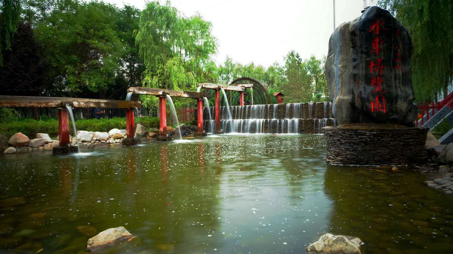 在水磨房出水處我們有一條蜿蜒小渠名為“曲水流觴“。再現(xiàn)九曲黃河內(nèi)水車林立、悠悠旋轉(zhuǎn)的景象。