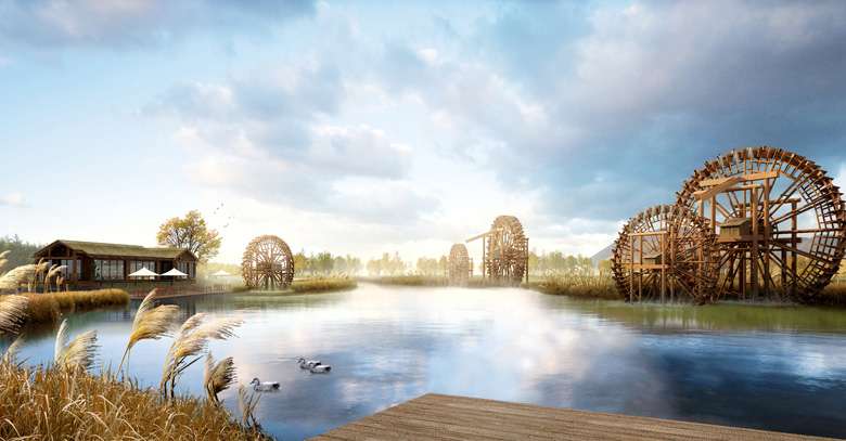 在水車廣場展現(xiàn)著各具特色的水車:在我們左側(cè)的是一架推水車(又稱水掛子),它依靠人力推動水車,將水提起,傾人水渠,灌溉農(nóng)田;在我們右側(cè)的是一架腳踏水車,其原理是用力踩動木輪,由傳動鏈條帶動水車,達(dá)到提水灌溉的目的;