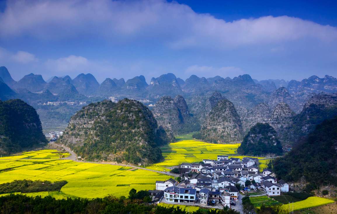 萬(wàn)畝油菜花:萬(wàn)畝油菜花盛開在烈烈暖陽(yáng)下,在層疊的峰林間,一座座峰林在初春的日光下延伸到天邊。山下是燦爛明黃的大海般的油菜花田,不知名的村寨掩映其中若隱若現(xiàn)。遠(yuǎn)處青山如黛,近處大片大片的油菜花開得熱烈燦爛。