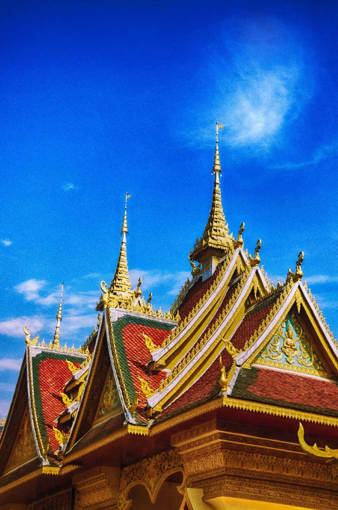 西雙版納傣族佛寺建筑,以重檐多坡面平瓦建筑為主。佛寺大多成方形,坐西朝東,屋頂坡面由三層相疊而成,中堂較高,東西兩側(cè)遞減,交錯起落。屋頂使用長方形片瓦,瓦尾鉤在平形的竹制橫椽之上。屋頂正脊及檐面之間的戧脊,用石灰抹平,上面排列各種瓦飾。正脊上的那瓦飾呈火焰狀,戧脊首端大多豎有鳳的形象,風(fēng)格獨特。各佛寺佛殿內(nèi)部由佛座、僧座和經(jīng)書臺3部分組成。佛座上塑的釋迦牟尼像,大多是坐像,佛祖的耳朵奇特,又大又寬,成“<”形。身材瘦削,眉清目秀,雙手扶膝,流露出一種神秘的氣氛,使人產(chǎn)生對傣族歷史追溯的好奇心。