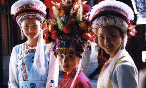 在周城至今仍能看到白族婚禮中古老而典雅的新娘裝束。新娘頭