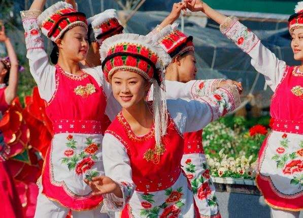 女子腰身苗條、婀娜,衣著色彩鮮艷、明快又大方。尤其是她們的繡花包頭,體現(xiàn)了大理的“風花雪月” 四景???,彎彎的包頭像洱海里的新月;艷麗的朵朵繡花代表了上關花;頂端潔白的纓須像蒼山頂?shù)陌籽?;耳際垂下的纓穗隨風飄灑,顯示了下關的風。
