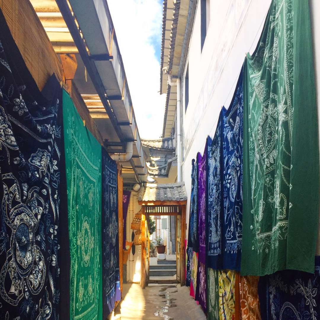 在周城,你還可以看到豐富的民族扎染制品。扎染是周城白族人民明末清初以來的民間傳統(tǒng)工藝,扎染工藝品集文化、藝術為一體。扎染布由手工針縫線扎,反復冷染浸制而成,顯色青里帶翠,凝重素雅,精工制作,圖案清新,色彩絢麗,遠銷海內(nèi)外。用扎染布制作的工藝品既充滿濃濃的民族風味,也很具現(xiàn)代韻味。