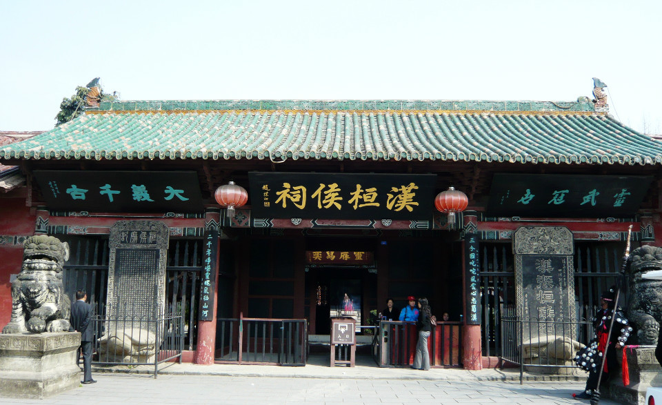 銅像周?chē)袕堬w四個(gè)歷史時(shí)期泥塑,主題分別為鞭打都郵、義釋嚴(yán)顏、大戰(zhàn)長(zhǎng)坂坡及閬中遇難。大殿銅像上面,懸掛了"力扶漢鼎"的牌匾。