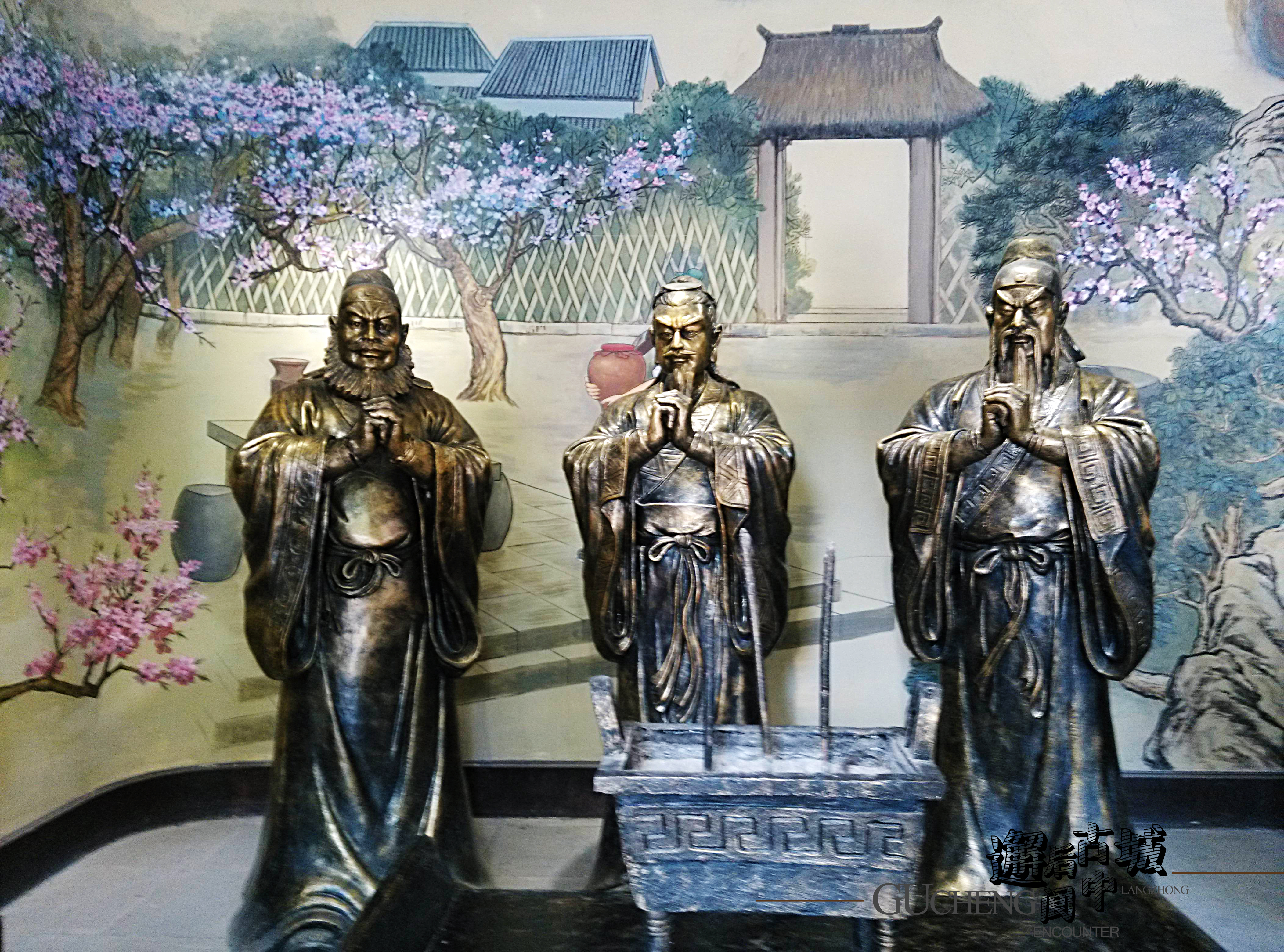 踏上陡峭的臺(tái)階走上二樓,劉、關(guān)、張?zhí)覉@三結(jié)義的雕塑面江而立,率先映入眼簾。