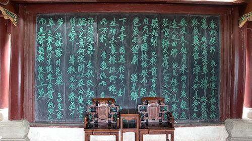 廟內(nèi)現(xiàn)存石碑和摩崖石刻及木刻書(shū)畫(huà)多達(dá)數(shù)百幅,書(shū)畫(huà)作品遠(yuǎn)自漢唐近至明清各代,名家薈萃,實(shí)為罕見(jiàn)。其中以木刻顏真卿書(shū)《爭(zhēng)座位帖》;石刻蘇軾作前、后《赤壁賦》大字長(zhǎng)卷;石刻岳飛書(shū)諸葛亮前、后《出師表》;黃庭堅(jiān)書(shū)《唐韓伯庸幽蘭賦》;鄭板橋書(shū)寫(xiě)的詩(shī)文和竹石、蘭石繪畫(huà)等最為著名。