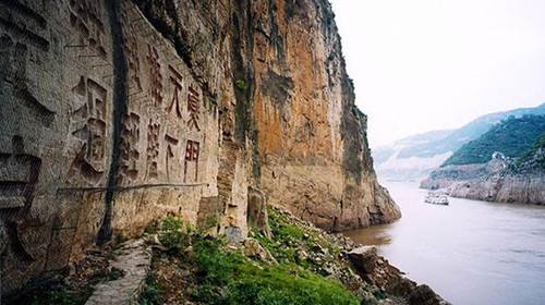在長江的白鹽山上,有一塊巖壁的顏色和其他地方不一樣,呈現(xiàn)出粉紅色,這里就叫做粉壁墻。而在粉壁墻上,則有著名的瞿塘摩崖題刻。在這些眾多的摩崖題刻里,比較有名的、也可以說形體比較大,大家在船上能清晰地看見的有兩個,一個是由孫元良將軍寫的“夔門天下雄,艦機輕輕過”,寫出了瞿塘峽特色所在;另一個是著名的愛國將領(lǐng)馮玉祥將軍所寫的“踏出夔巫,打走倭寇”,以激勵由此出川抗日的將士。