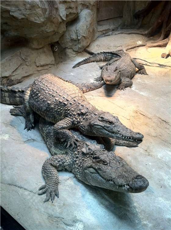 鱷魚是現(xiàn)存的最大的爬行動物,它與恐龍是同時代的,不過恐龍已成為過去,鱷魚能夠存活下來也證明了它頑強的生命力。鱷魚喜歡溫暖,喜歡在陽光下漂浮在水面一動不動,它獨有的偽裝術(shù)往往讓游客迷糊了雙眼。當(dāng)飼養(yǎng)員將它們喜歡的魚用竹竿勾住伸向它們時,鱷魚們就卸下偽裝表現(xiàn)出該有的活力,讓游客們大飽眼福。