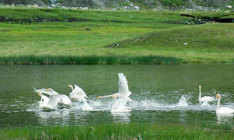湖水與周圍開闊的沼澤濕地和河谷草原上,棲息著種類繁多的禽鳥,成群的野鴨、大雁和天鵝等時(shí)常