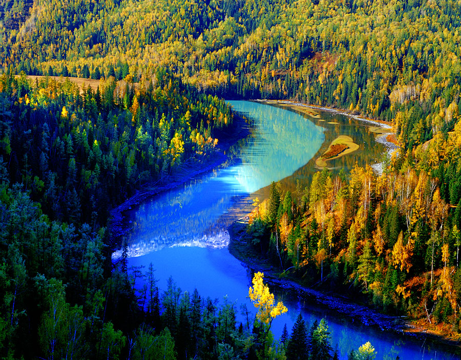 深秋時(shí)節(jié)是月亮灣色彩最豐富景色最迷人的時(shí)候。山頂?shù)难┖涂~緲的霧是白色,山腰的西伯利亞落葉松和白樺樹(shù)的葉是金黃色,間雜其中的冷杉和云杉翠綠色,河水是翡翠色,九月底的月亮灣還有楓樹(shù)的紅葉映襯,簡(jiǎn)直就是上帝的調(diào)色板。