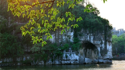 象鼻山,簡稱“象山”,位于漓江與桃花江(舊稱陽江)匯流處,因其山形酷似一只站在漓江邊伸長鼻子飽飲江水的大象而得名。象鼻山因在漓江之濱,原名“漓山”。唐會(huì)昌年間(841—846年),唐代詩人、桂管觀察使元晦以“漓山”之名與陜西臨潼的“驪山”音同,為避其誤會(huì),又取風(fēng)景宜人之意,更名“宜山”。后又將“宜山”寫作“儀山”,因古文“宜”與“儀”通,音也一樣。唐代莫休符在《桂林風(fēng)土記》中說,漓山“一名沉水山,以其在水中,遂名之?!背了街跉v史上文人士大夫之中很少見,估計(jì)是民間的俗稱。明朝孔鏞也曾在廣東、山西、貴州等地任職。他有一首著名的《象鼻山》詩,對(duì)象鼻山作了生動(dòng)的描繪: