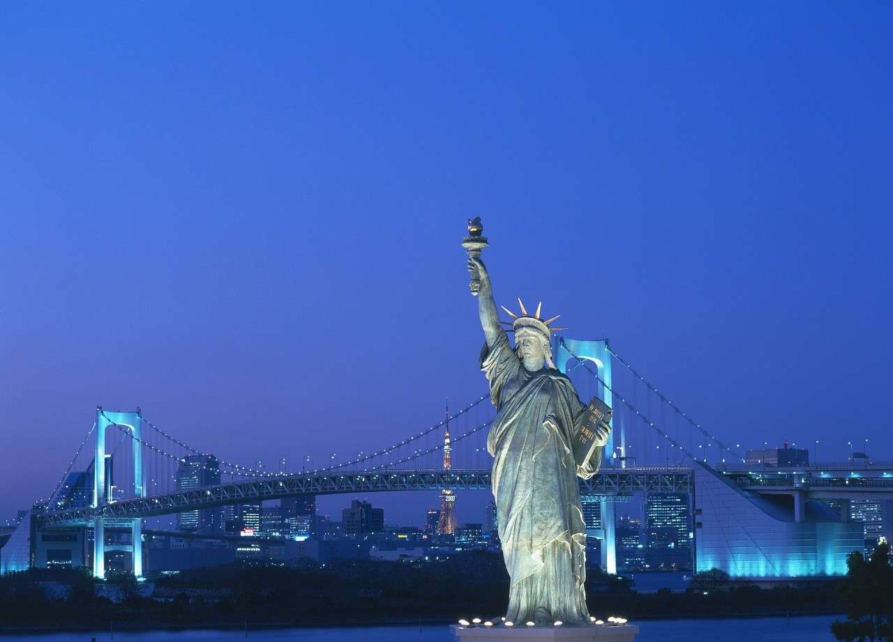 現(xiàn)在設(shè)置在臺場的自由女神像,是原物歸還后,在回應(yīng)一片惋惜聲中制作的復(fù)制品,雖然如此,現(xiàn)在她已變成臺場的標(biāo)志。以彩虹大橋為背景,與女神一起合影留念是不可缺少的活動項目了。
