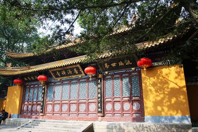 天王殿。亦稱金剛殿,面寬五間,進(jìn)深四間,重檐歇山。進(jìn)門迎面是一彌勒菩薩,光首、笑臉、袒胸、盤坐,一手拿一只布袋。據(jù)說他能將世人一切苦難裝入布袋之中。佛像兩旁有一副對聯(lián):“慈顏含笑笑天下之可笑之人,大腹可容容世間難容之事”,以勸人們慈悲大度為懷,用樂觀態(tài)度對待風(fēng)雨變幻的生活。彌勒菩薩后面的塑像是韋馱菩薩,昂然挺立,手持寶杵,據(jù)傳韋馱是神將之首,常于東、南、西三州巡游,守護(hù)伽藍(lán),屬護(hù)法神。兩旁的四大天王宛如四名衛(wèi)士在維護(hù)法門,他們是東、南、西、北四個(gè)方面的天王,各自手里拿著法器。殿后有香樟8株,直徑0.8-2米多,植茂蓋庭。