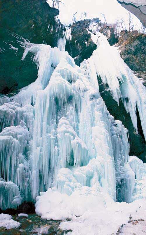尊敬的游客朋友,剛才我們欣賞了蔚然壯觀的石壁天河,馬上就要看到風(fēng)韻萬(wàn)千的白石山了。峰回路轉(zhuǎn),一道瀑流忽然從天而降,猶如一條銀龍從空中飛下,悠悠忽忽,晃晃蕩蕩,神態(tài)瀟灑自如。細(xì)看這條瀑布,它是從幾十丈高的山崖頂上落下的,自古只有水往低處流,而這里的山崖兩側(cè)溝內(nèi)無(wú)水,崖頂卻有瀑布,真是“水往高處流”。隨河風(fēng)輕拂,它飄飄灑灑,飄逸而矯健,給人以無(wú)限聯(lián)想,“飛流直下三千尺,凝似銀河落九天”正是它的傳神寫(xiě)照。潔白的瀑流擊在棱角突兀的巖石上,濺起串串晶瑩的珍珠,向四面八方飛散而去。道道涓涓細(xì)流,化成條條白龍,從巖石的四周蜿蜒游去。在官鵝溝眾多的瀑布中,九天飛瀑以它的凌空飛瀉,瀟灑自如而獨(dú)樹(shù)一幟。
