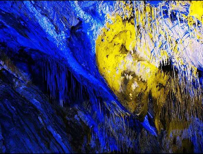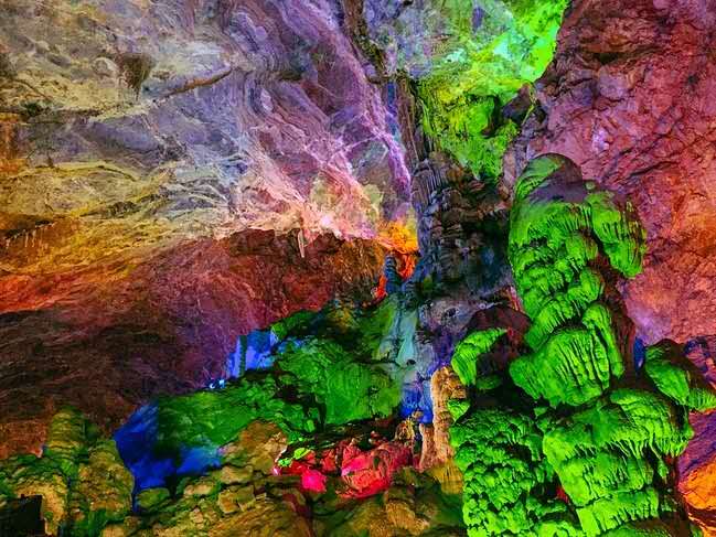 通過一道光潔的,地面上像砌滿了云片似的走廊后,(即為“臥龍壩”)就來到了第二景區(qū)——龍宮。壩上有二龍蟠伏,鱗甲浮動,閃閃發(fā)光,仿佛觸之即飛。過“溜馬槽”則為“黃龍灘”,中有仙人“煉丹井”,深不可測。設有“仙人床”,床頭有“仙人枕”,壁上有“仙人燈”,床下有“仙人履”。內壁角有一小洞,高闊不足1米,深約1.7米,游人爬行而過,是全洞最狹窄的地方,因涼風習習,故稱“風洞”。