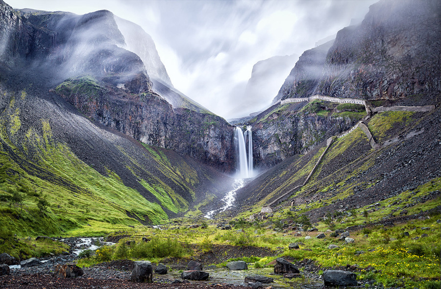 從谷底到瀑布絕頂總長約2300米,瀑布從絕頂傾泄而下,形成了多處飛流。斜坡的右側(cè)修建有一條曲折棧道,便于游客觀景。