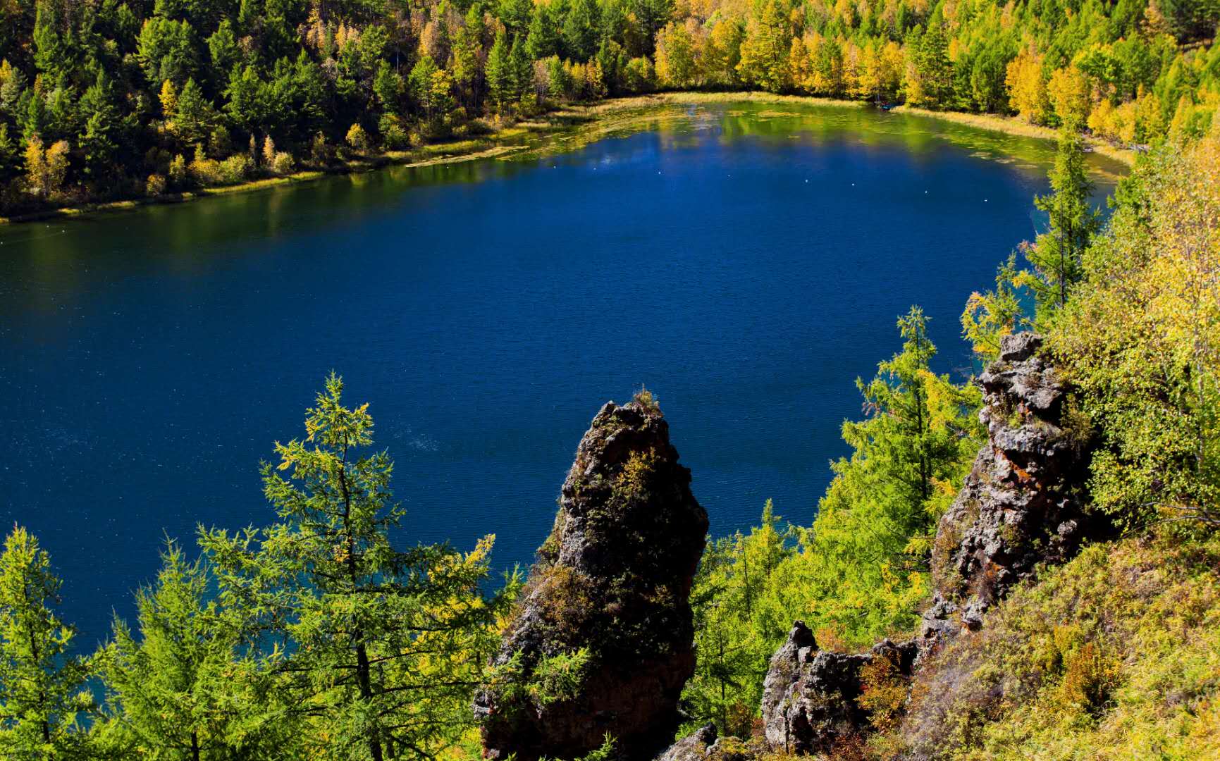 阿爾山天池,位于阿爾山市東北74公里的天池嶺上,由火山噴出物落在噴火口周圍形成一道環(huán)狀圍墻,中間形成圓形凹坑,多年積水而成。