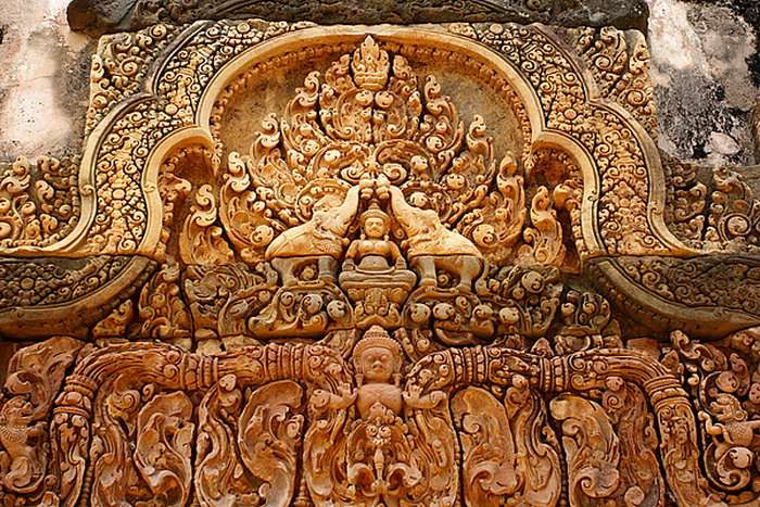 女皇宮的墻壁、立柱、門楣等建筑表面幾乎完全被浮雕覆蓋,沒有一點空隙。女皇宮浮雕刀工流暢細膩,造型繁復圓潤,線條纖巧柔美,色彩鮮艷嫵媚,在所有吳哥浮雕中首屈一指,被譽為“吳哥藝術(shù)之鉆”。