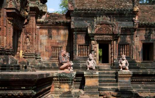 建于十世紀的女皇宮,充分展現(xiàn)了吳哥時期高超的雕刻功力,細膩而傳神的刻畫,代表了吳哥人民的藝術(shù)天份,與對宗教的信仰熱忱。紅色的石墻,生動的故事,交織出一幅幅柔美的圖畫,不斷訴說著印度史詩中的各個章節(jié);透過浮雕的傳達,前人藉此留下印記,即使是過了幾個世紀之久,后代的人們都還能從中讀出一二,歷史不朽也就是如此了。