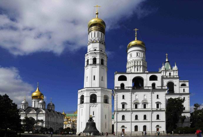 人們從遠處遙望克里姆林宮,不難發(fā)現(xiàn)有一座建筑高高地矗立在建筑群體中,有鶴立雞群之感。這個高大建筑就是教堂廣場上的伊凡大帝鐘樓。它高81米,是古時的信號臺和望臺。鐘樓的左側有重達40 噸的炮王,右側是著名的鐘王。這兩個龐然大物雖然從未使用過,但卻顯示出了俄羅斯工匠高超的鑄造技術。