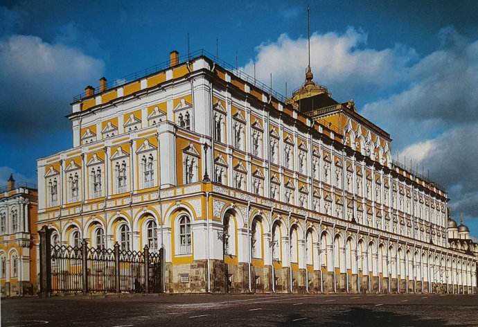 1838年,大克里姆林宮重建,全部由俄羅斯工匠采用本國建筑材料建成,外表看是三層建筑,實際是兩層,第一層向前突出,構成一個露天陽臺,后來作為蘇聯(lián)政府、蘇共中央和社會團體舉行會議的場所。