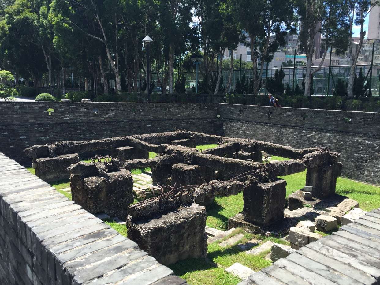 踏進(jìn)公園南門,兩旁灰色的四方磚柱上,分別有“九龍寨城”和“南門”的大字鐫刻。繞過刻有公園碑記的照壁,景物豁然開朗,一座三進(jìn)的衙門映入眼簾。這是寨城內(nèi)惟一保留下來的古建筑,修葺后回復(fù)本來的面貌,立于公園中心。衙門前有古炮兩尊,西側(cè)尚存一方古井。衙門內(nèi)陳列著一些在寨城中發(fā)掘出來的文物,包括刻有大鵬協(xié)副將張玉堂拳書“墨緣”和“壽”字的兩塊石碑等。衙門大堂還陳展著1902年寨城的平面圖,圖文并茂地介紹寨城的歷史和公園興修的經(jīng)過。
