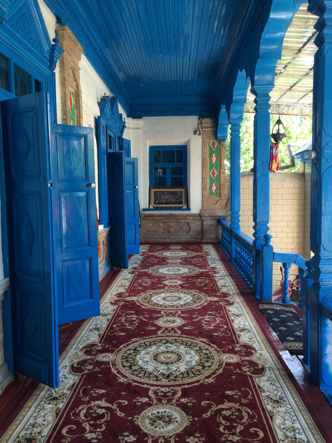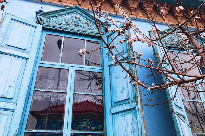 這里的民居與環(huán)境始終保持著較為完整的傳統(tǒng)風(fēng)貌與格局,頗具中西亞特色及“塔蘭奇”傳統(tǒng)文化風(fēng)格??澠涞姆课萁ㄖ?duì)藍(lán)色的使用頻率非常高,或者在外墻,或者在屋頂,更多時(shí)候是在門板和窗欞,藍(lán)色大都是主色調(diào),整個(gè)建筑顯得精致而純凈。