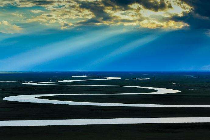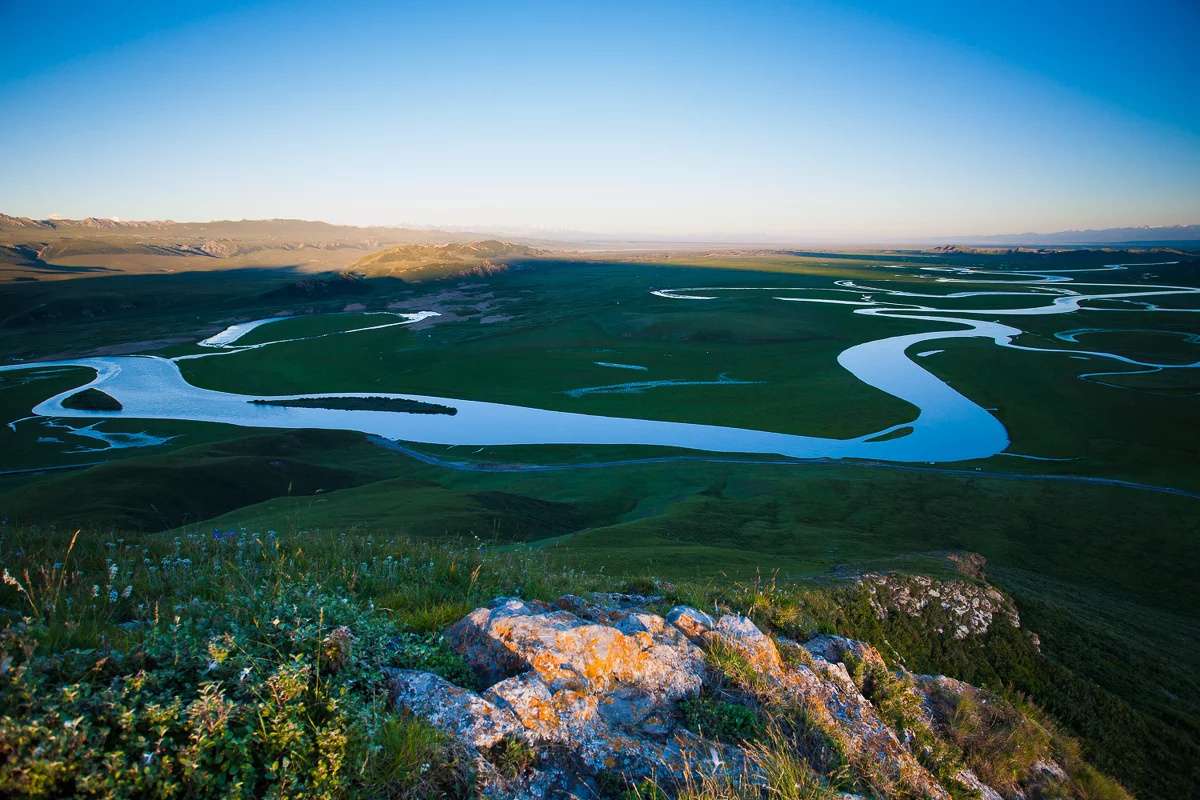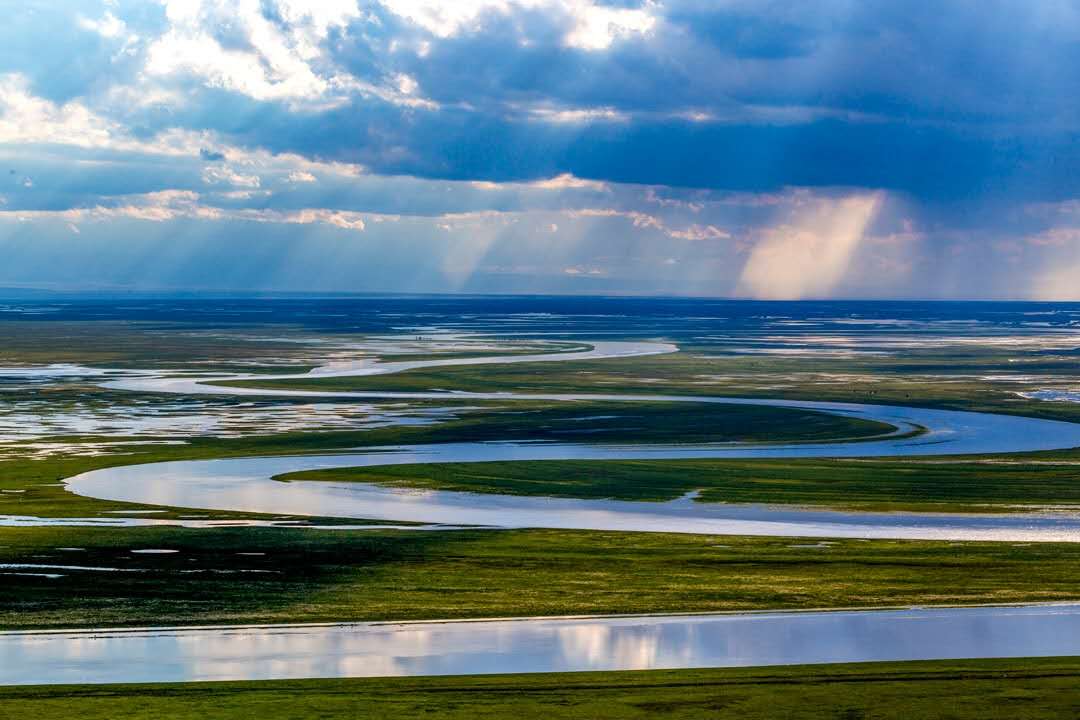 開(kāi)都河的源頭云霧繚繞,特別是盛夏,云涯水暖,云水難辨,仿佛河水從天而降。開(kāi)都河上游河流由小尤勒都斯盆地,經(jīng)過(guò)巴音布魯克,到大尤勒都斯盆地,水流平緩,河谷開(kāi)闊,四周牧草豐茂,是天然的優(yōu)良牧場(chǎng)。特別是在小尤勒都斯盆地平坦遼闊的草原上,開(kāi)都河蜿蜒流淌,形成九曲十八彎的壯麗景象。那模樣,像一個(gè)大寫(xiě)的蒙古文字,有一種鬼斧神工的靈氣。
